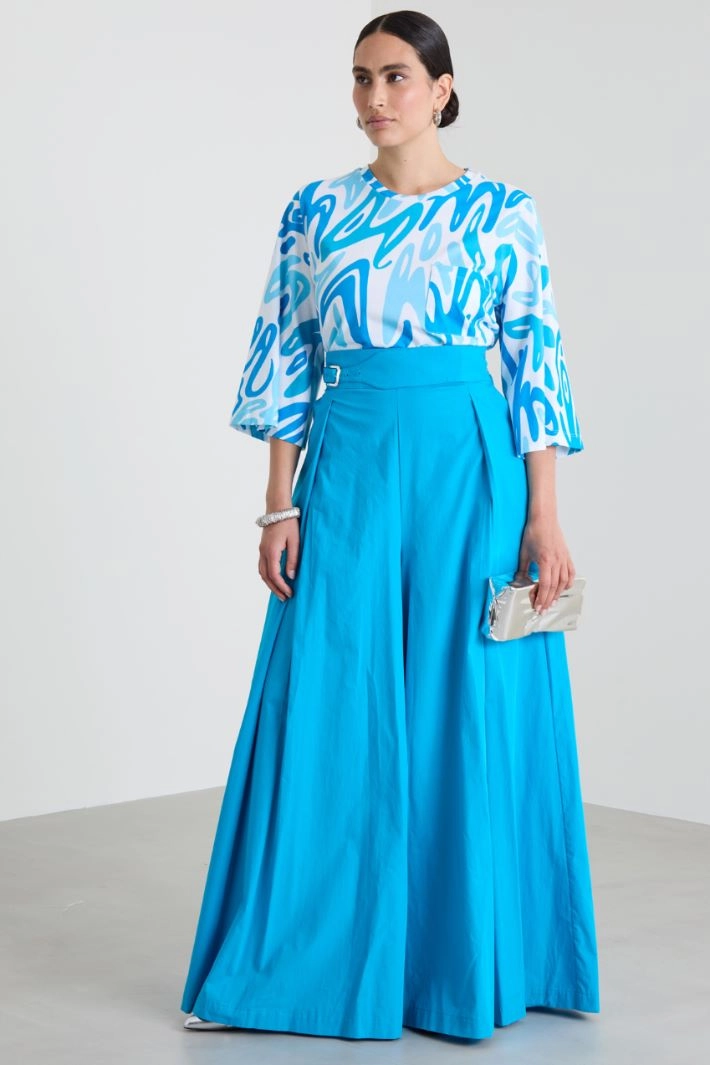 Wide-leg trousers in pure cotton poplin, with adjustable waistband, stitched pleat motif, side French pockets and fastening with invisible zip and buttons on the side