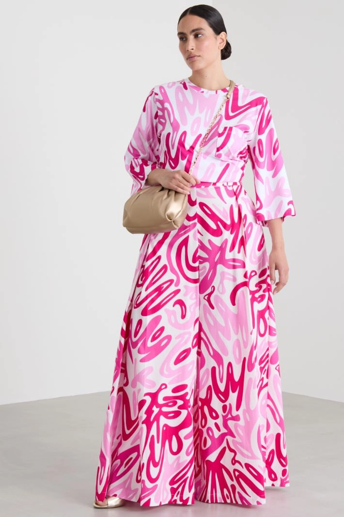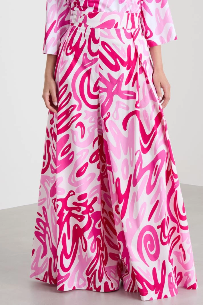 Wide-leg trousers in printed pure cotton poplin, with an adjustable waistband, stitched pleat motif, side French pockets and fastening with invisible zip and buttons on the side.