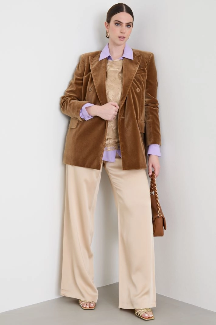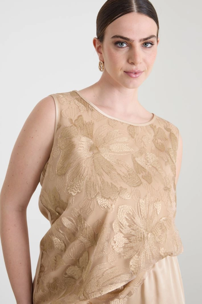 Straight-cut top in embroidered lamé tulle, with a shiny enver satin panel on the back, round neckline and sleeveless. Partially-lined.