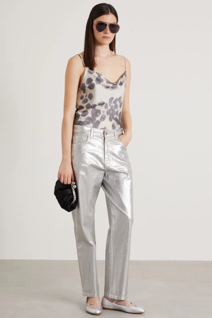 Loose-fit top in hammered satin with all-over print, with draped neckline and thin shoulder straps.