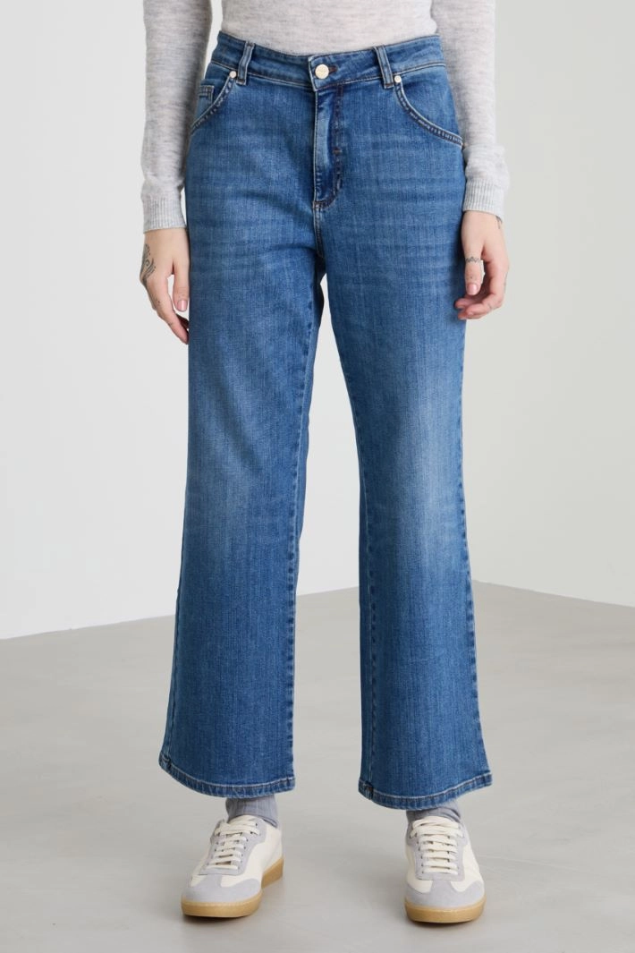 Straight-fit bootcut jeans in stretch cotton denim, featuring five pockets. Concealed zip and button fastening.