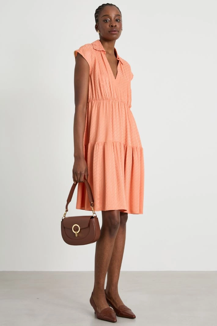 Loose-fit dress in jacquard fabric, with shirt collar, V-neck, cap sleeves and flounce motif.