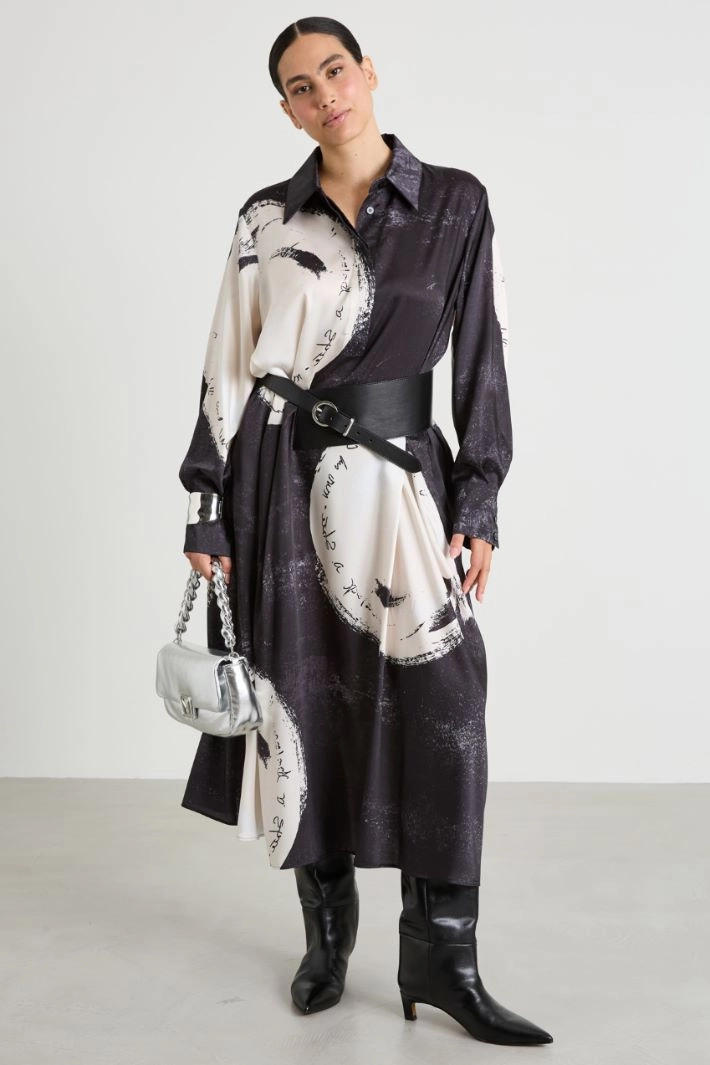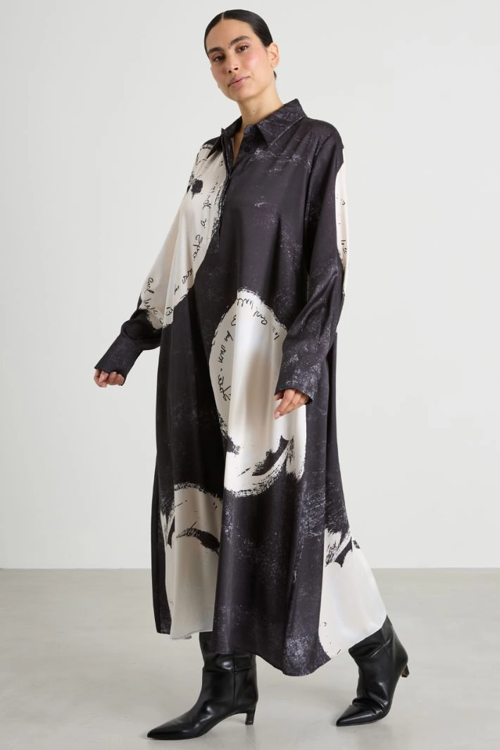 A-line dress in printed twill, with a shirt collar, hidden polo opening with buttons, long sleeves with cuffs and buttons, and inset pockets.