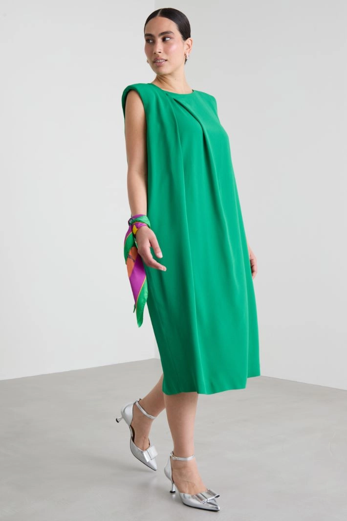 Straight-fit envers satin dress with round neckline, counter pleat motif sewn on the shoulder, padded shoulder straps and central slit in the back. Invisible zip fastening on the back. Lined.