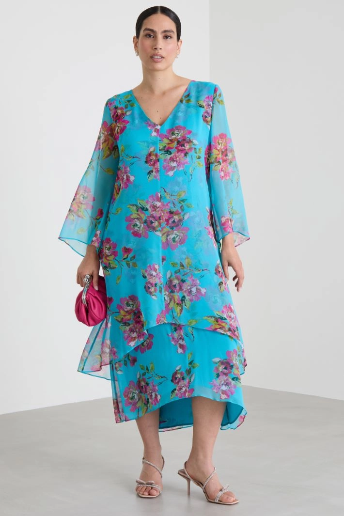Asymmetrical flared midi dress in printed pure silk georgette, with a V-neckline at the front and back, long sleeves and a flounced hem. Invisible zip fastening at the back. Semi-lined.