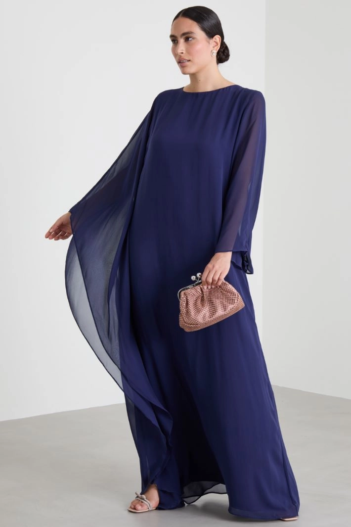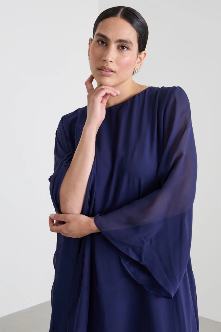 Long kaftan dress in pure silk georgette, with a boat neckline, long asymmetrical sleeves and invisible zip fastening on the back. Partially lined.