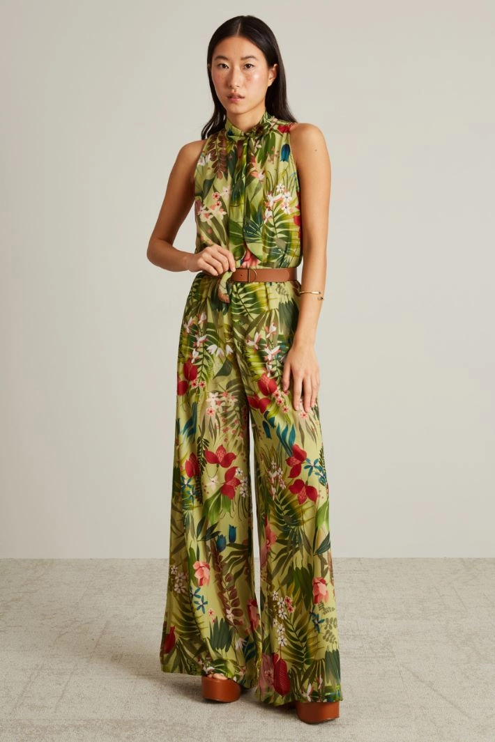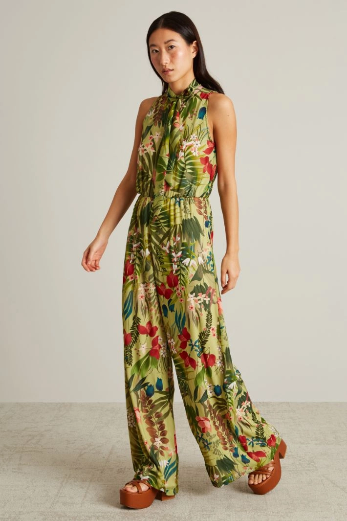 Long flowing jumpsuit in all-over printed chiffon, with a scarf collar and a teardrop opening on the front, an elasticated insert at the waist and an invisible zip fastening on the back. Lined.