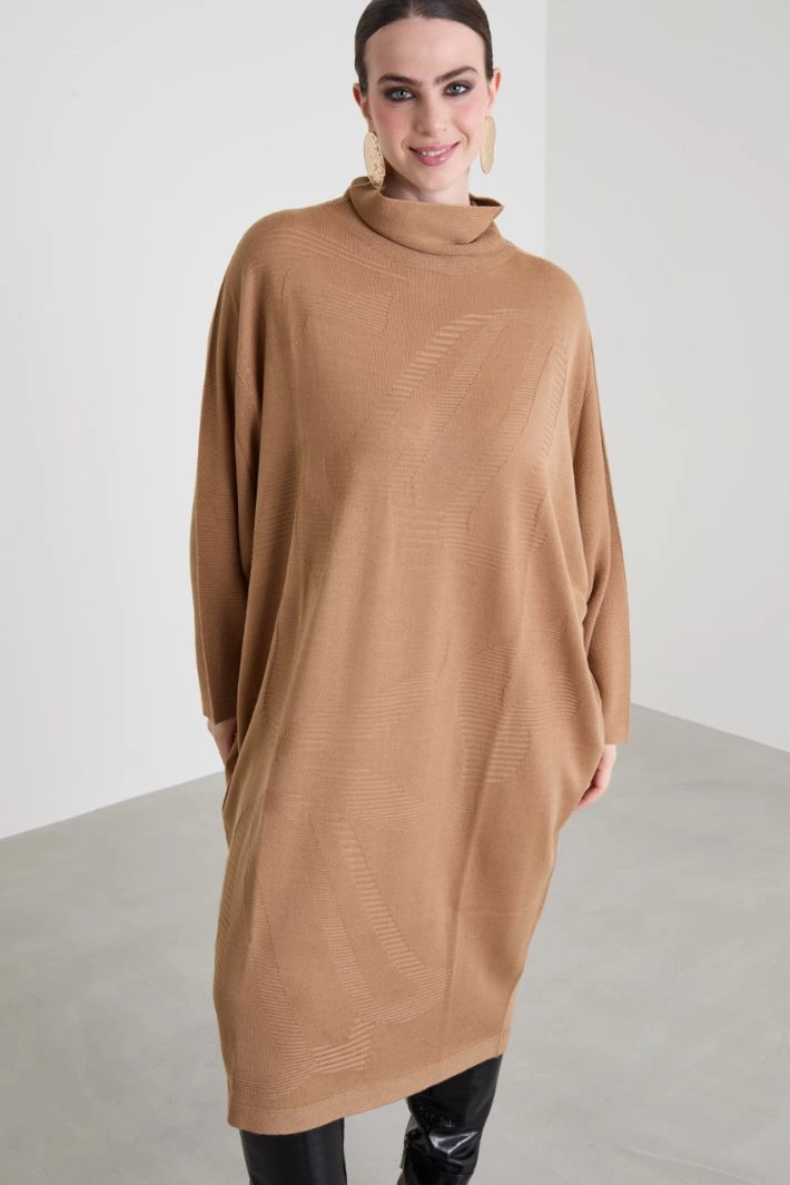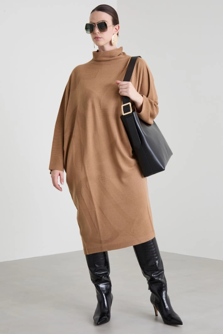 Loose-fit trapeze dress in wool blend knit, with ribbed trim, high neck and long dropped sleeves.