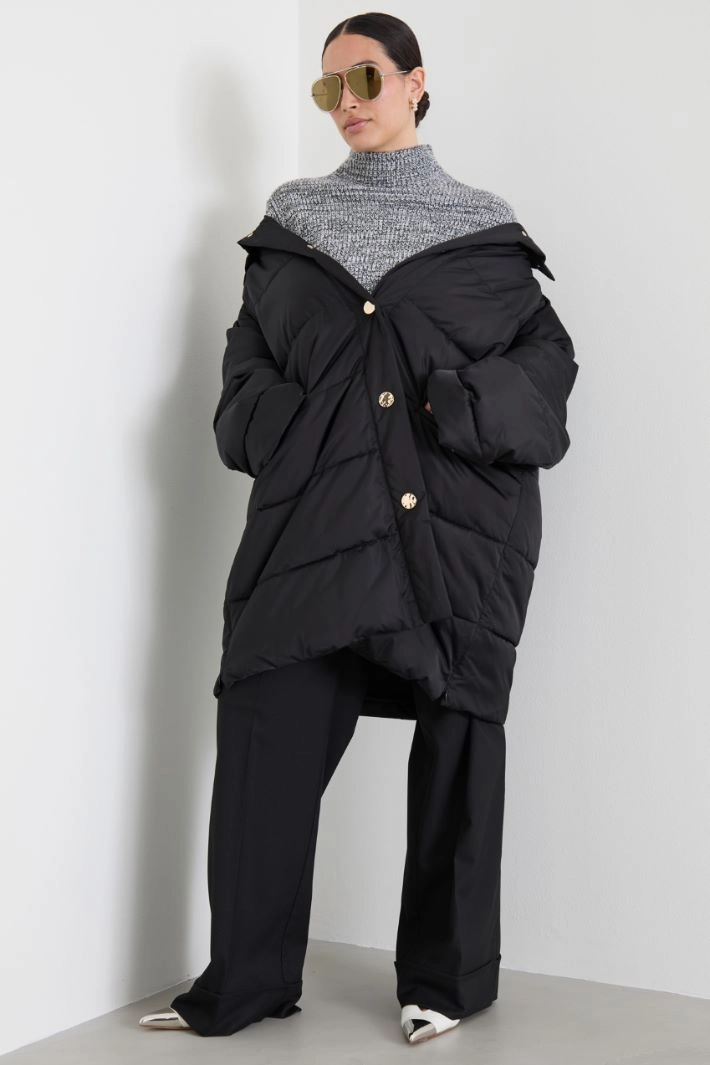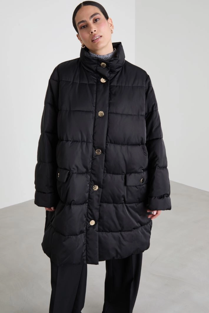 Long padded jacket with a slightly flared hem in water-repellent quilted technical satin, with a high collar, long sleeves, side welt pockets with flap and single-breasted fastening with metal snap buttons.