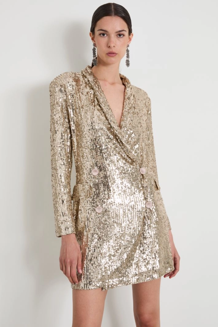 Semi-fitted dress in sequined jersey, with shawl collar, long sleeves and flap pockets. Double-breasted button fastening. Lined.