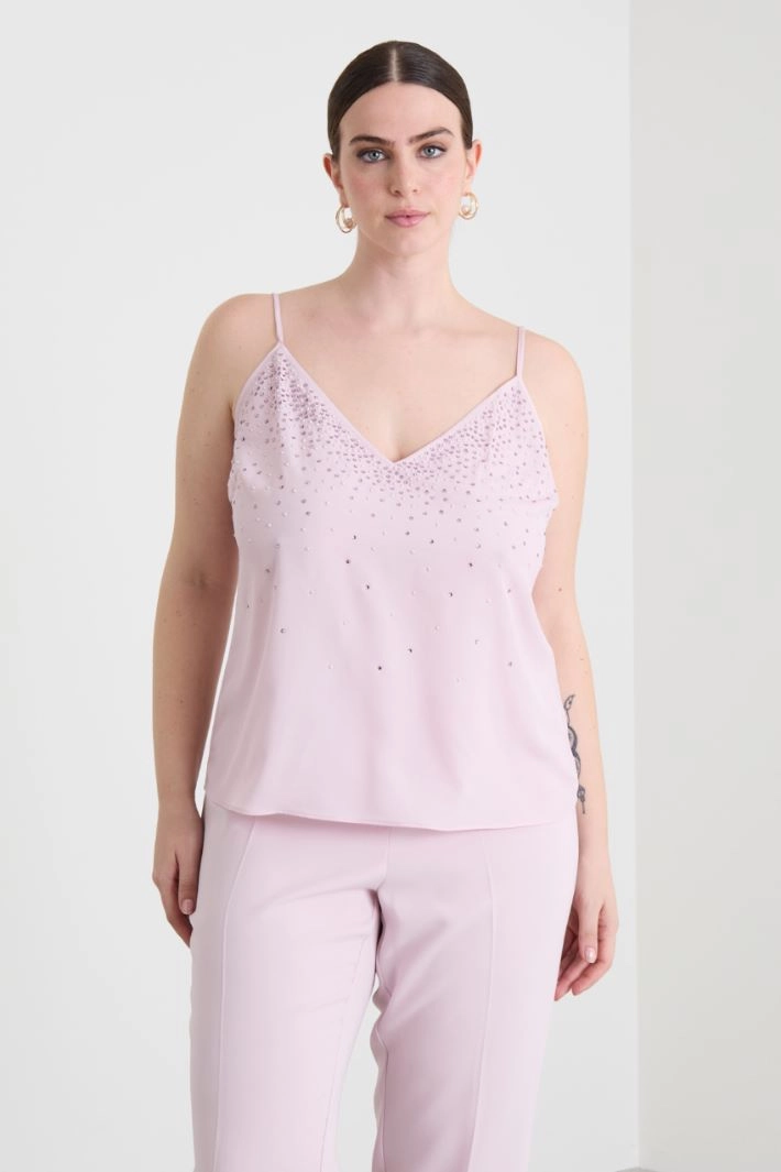Crepe de Chine top with rhinestone and pearl detail on the front, and adjustable shoulder straps