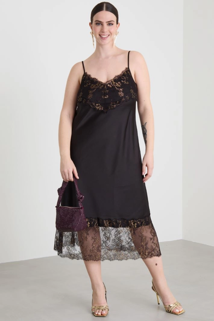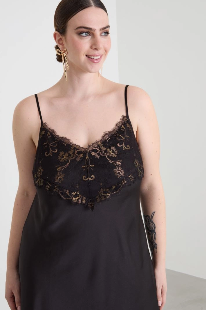 Flowing slip satin dress with lamé lace inserts, V-neck and thin shoulder straps.