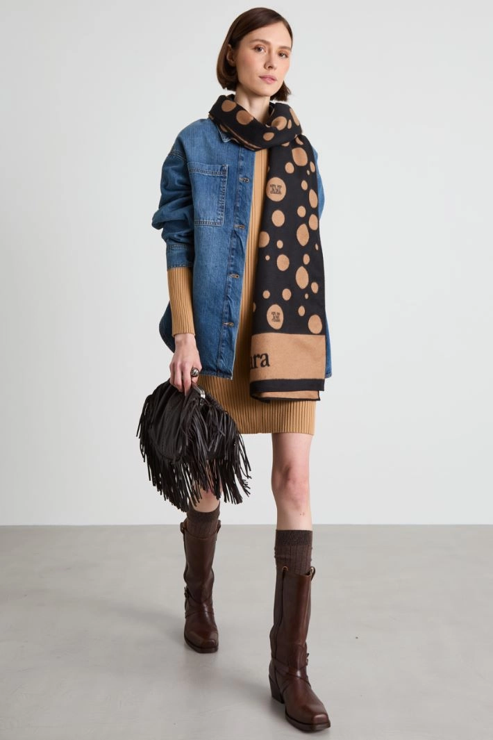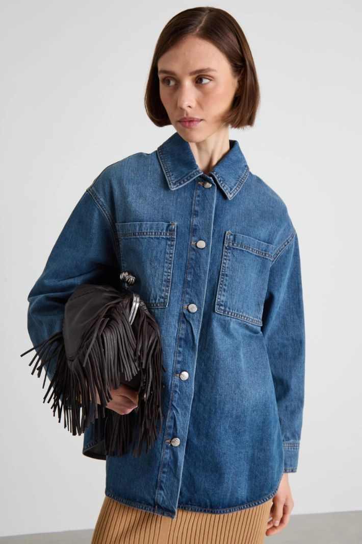 Loose-fitting shirt jacket in pure cotton denim, with a classic collar, long dropped sleeves, patch pockets on the chest and a rounded hem. Single-breasted fastening with metal buttons.