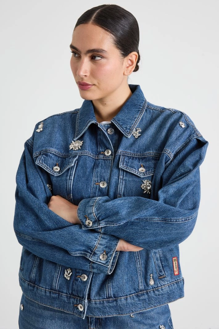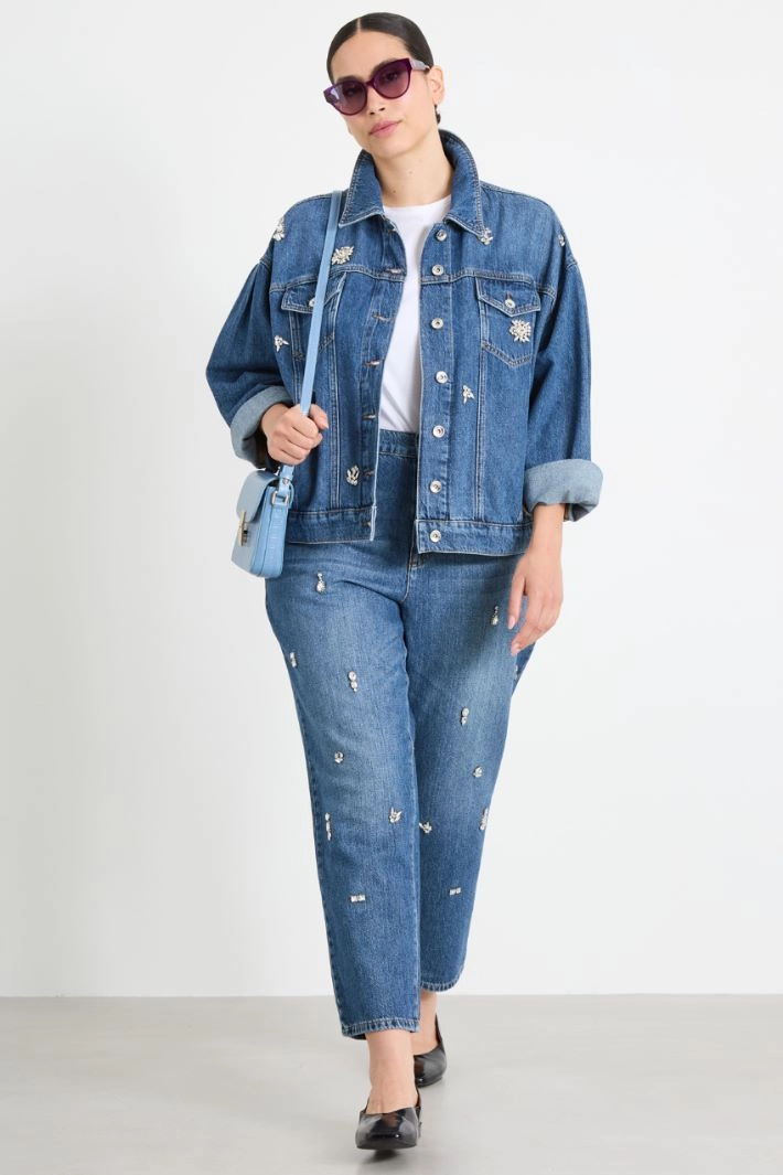 Slightly oversized jacket in pure cotton denim with embroidered stone detail on the front, shirt collar, long sleeves with cuff and button, adjustable toggles at the waist on the back, patch pockets with flap on the chest and welt pockets on the sides. Button fastening.