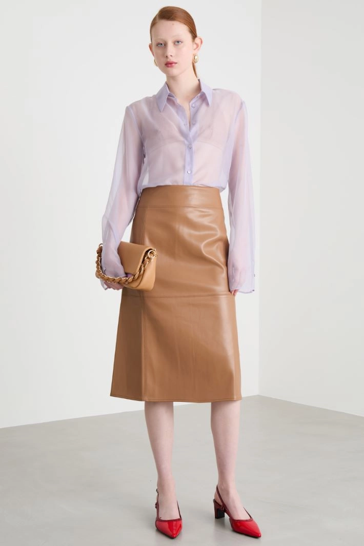 Straight-cut shirt in organza, featuring a pointed collar and long sleeves with buttoned cuffs. Button fastening.