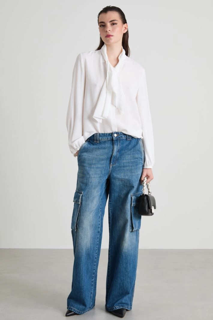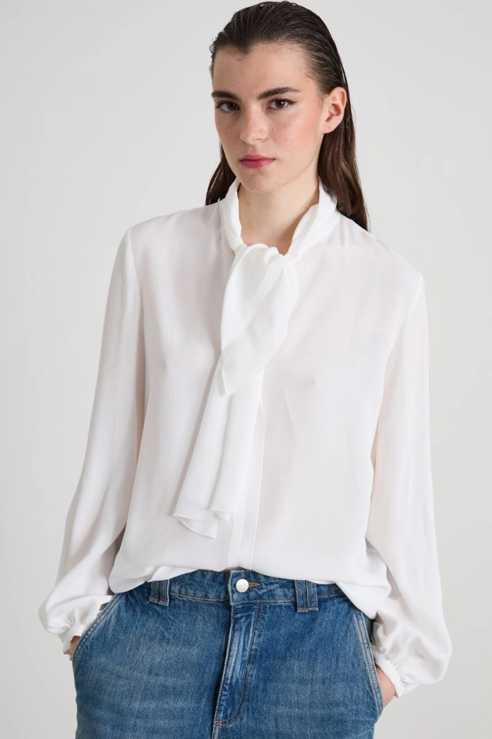 Flowing blouse in silk blend crepe de chine, with a scarf collar finished with a V-shaped opening, a pleat motif on the front and long puff sleeves with thin cuffs and button.