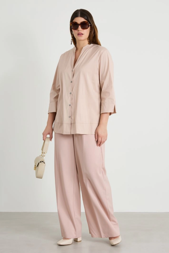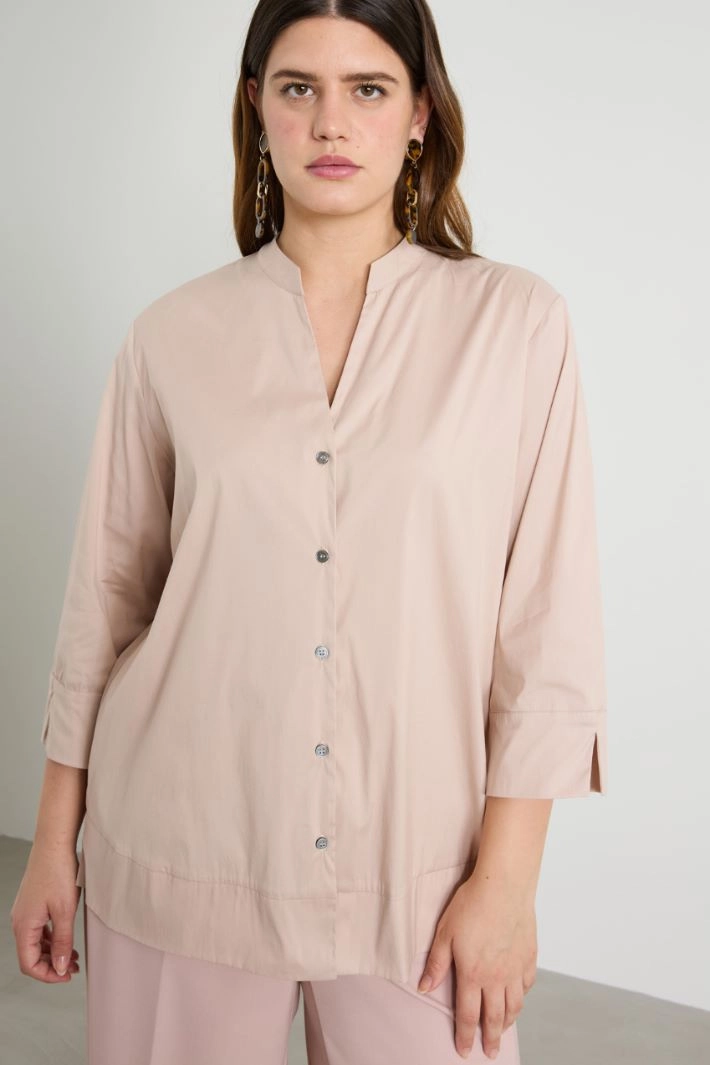 Straight-cut shirt in stretch cotton-blend poplin, with stand-up collar and V-neck, three-quarter sleeves and side slits. Fastening with visible buttons.