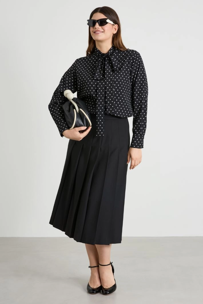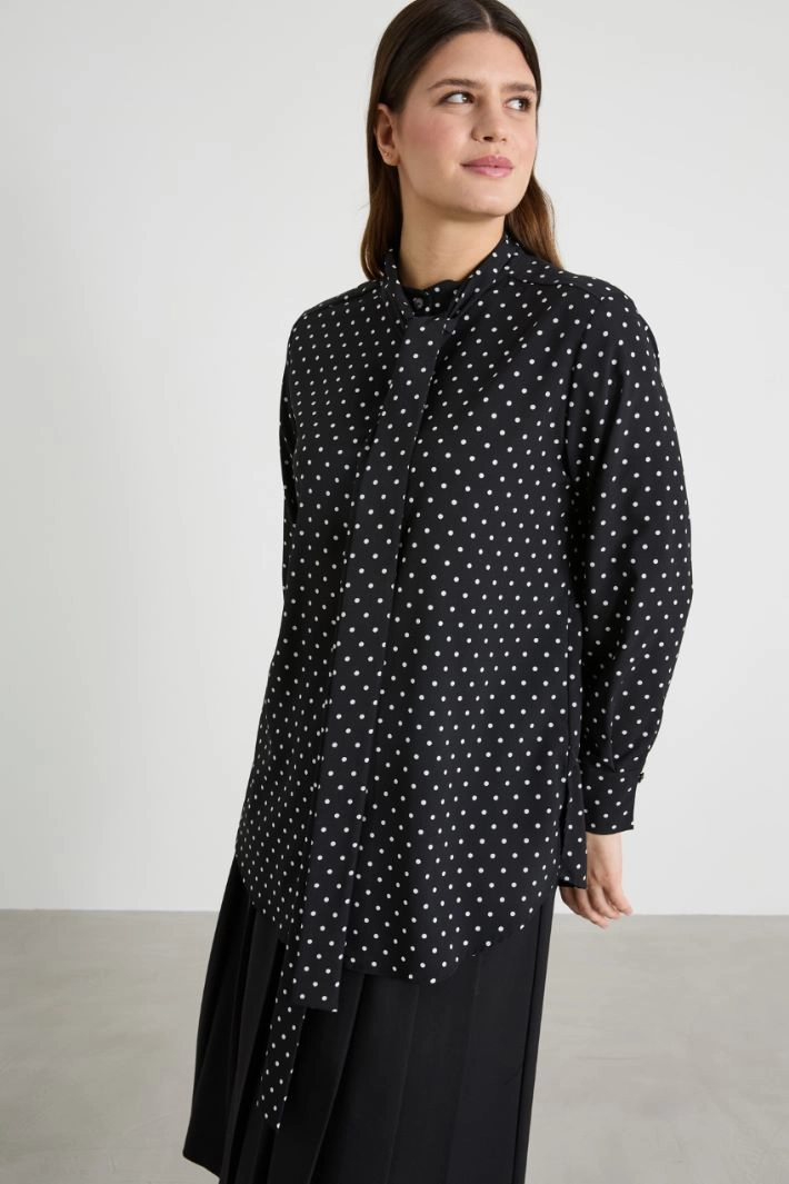 Straight-cut shirt in crepe de chine, with stand-up collar, long sleeves with button, yoke with counter pleat on the back and side slits at the hem. Button fastening. Matching sash.