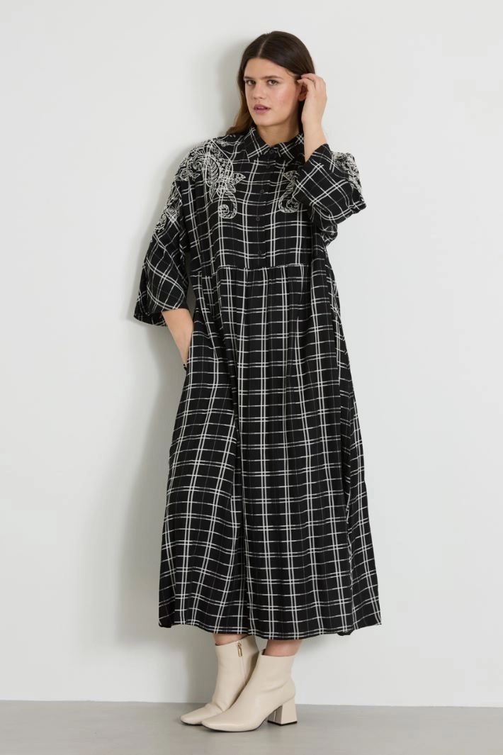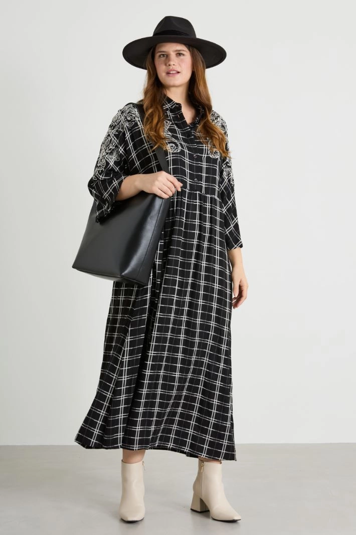 Flared dress in viscose fabric, with shirt collar, three-quarter kimono sleeves and inset side pockets. Button fastening.