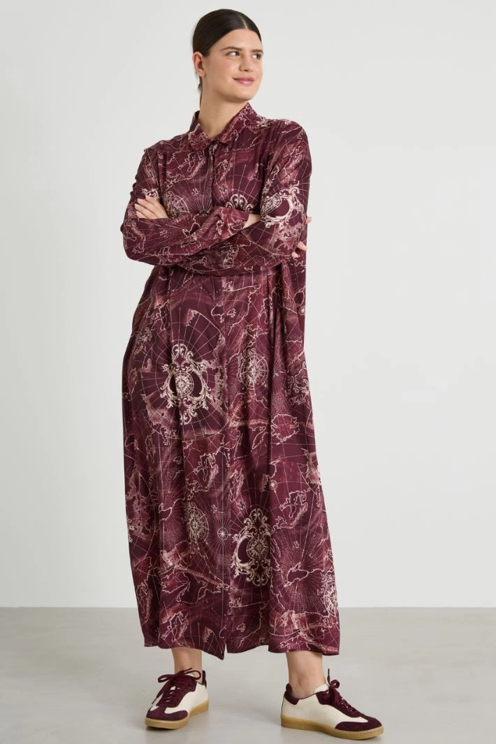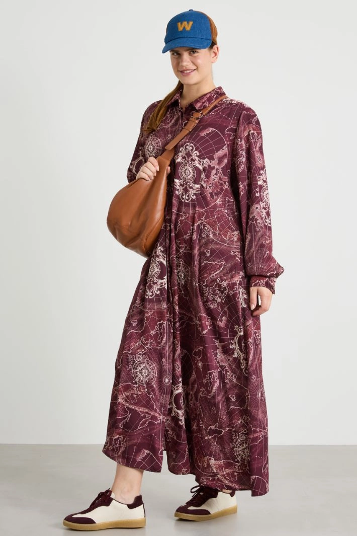 Flared dress in all-over printed twill, with shirt collar, long sleeves with cuff and button, inset pockets on the sides and matching belt. Hidden button fastening.