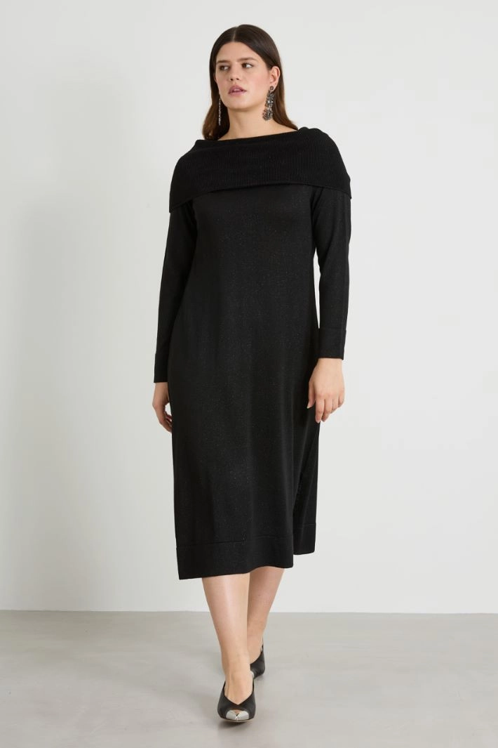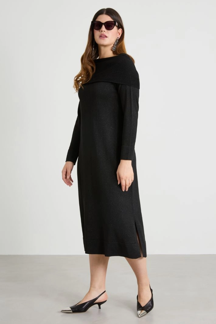 Flared dress in viscose and wool blend yarn with lamé, a wide collar with lapel, long sleeves and slits at the hem.