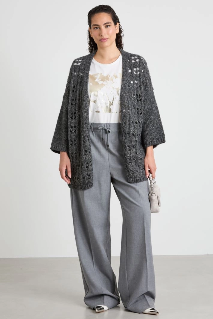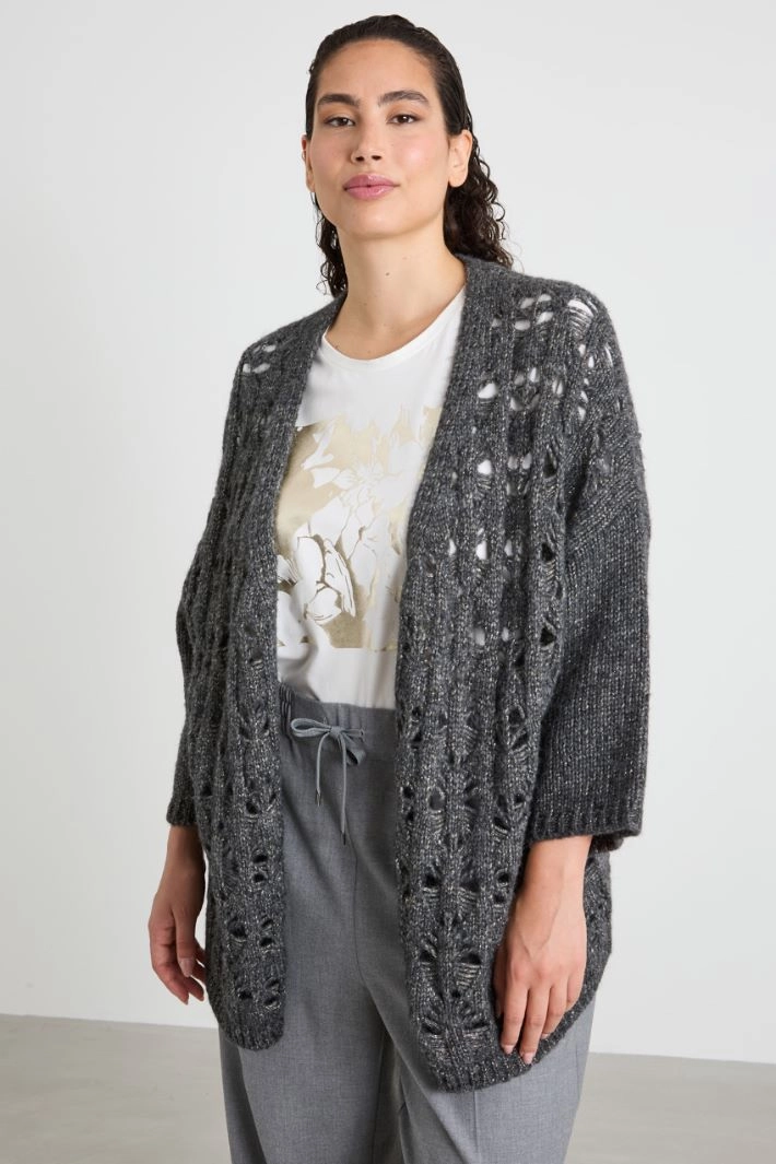 Straight-cut cardigan in lamé blend yarn, with a V-neck and three-quarter sleeves.