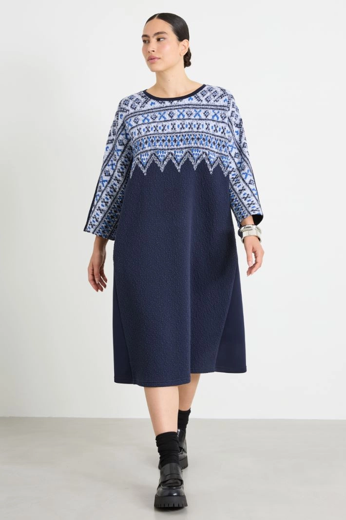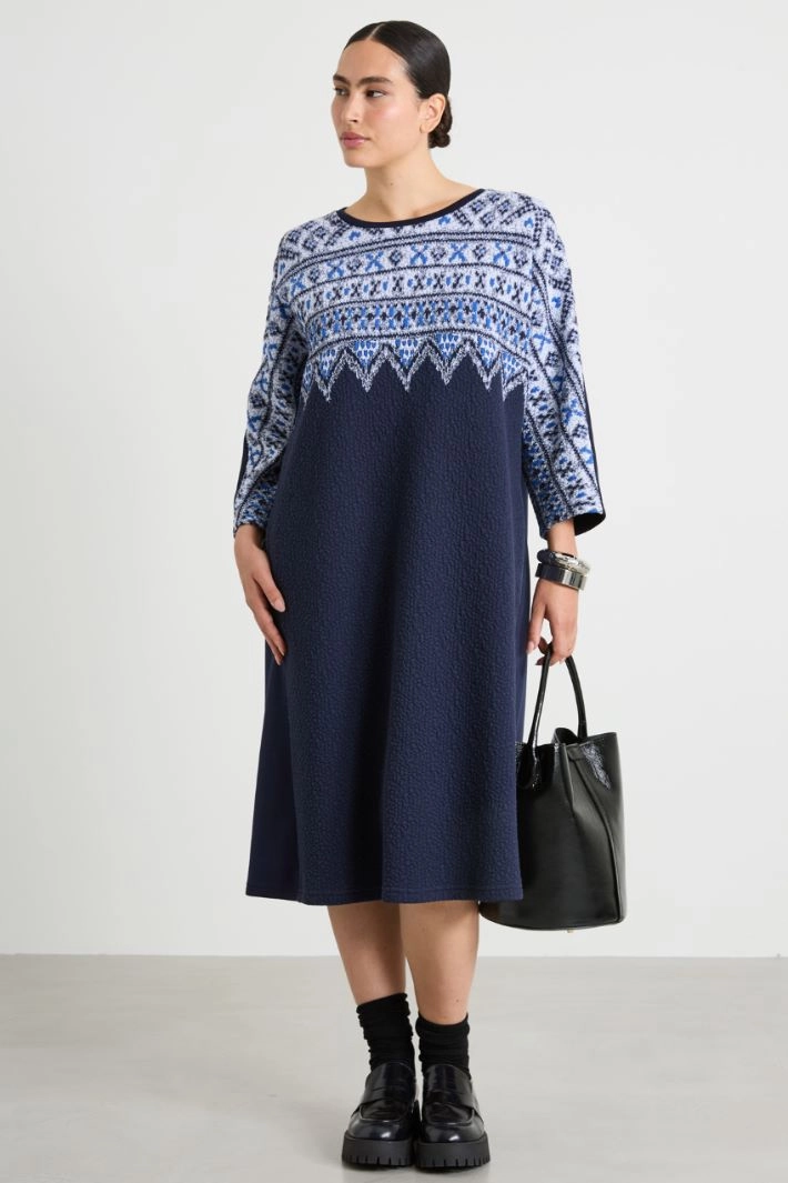A-line dress in viscose-blend jacquard jersey with a crew neck, three-quarter kimono sleeves, and inset pockets. Concealed zip fastening at the back.