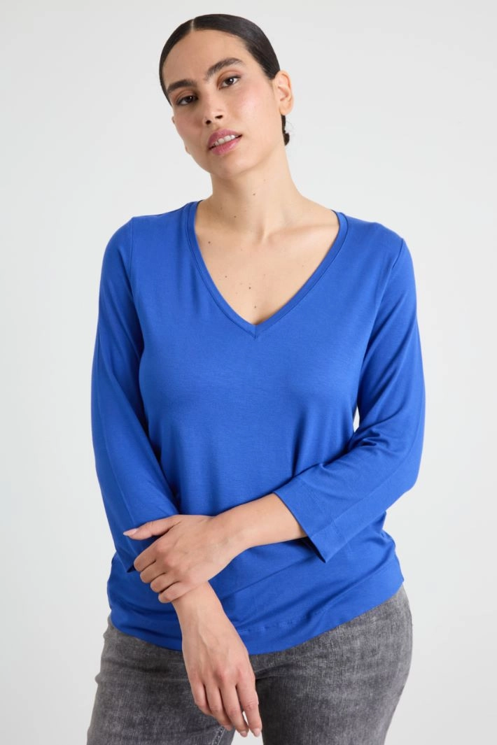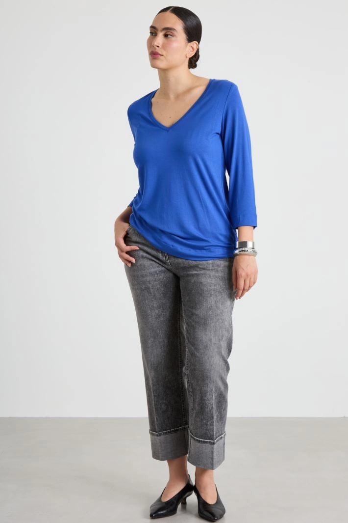 Straight-cut T-shirt in stretch viscose jersey, with a V-neck and three-quarter sleeves.