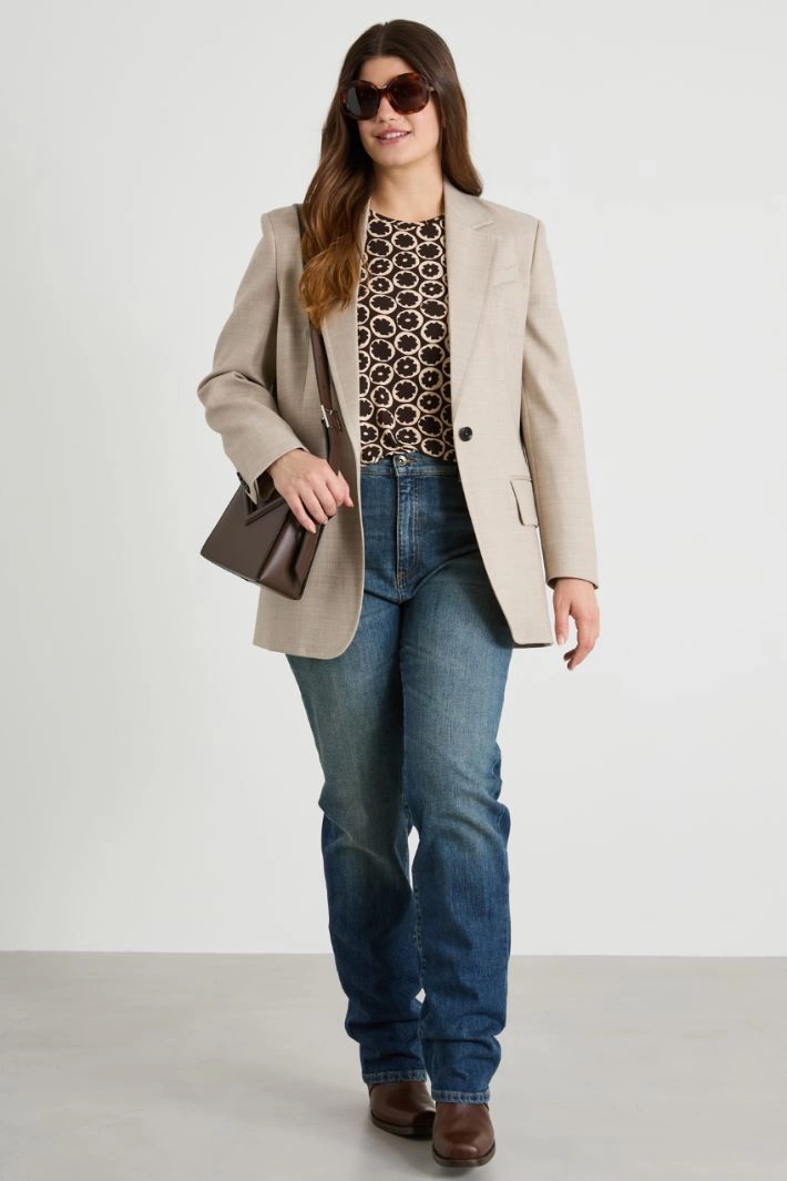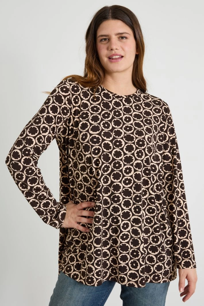 Flared T-shirt in all-over printed jersey, with crew neck, long sleeves, gathered back and asymmetrical hem.