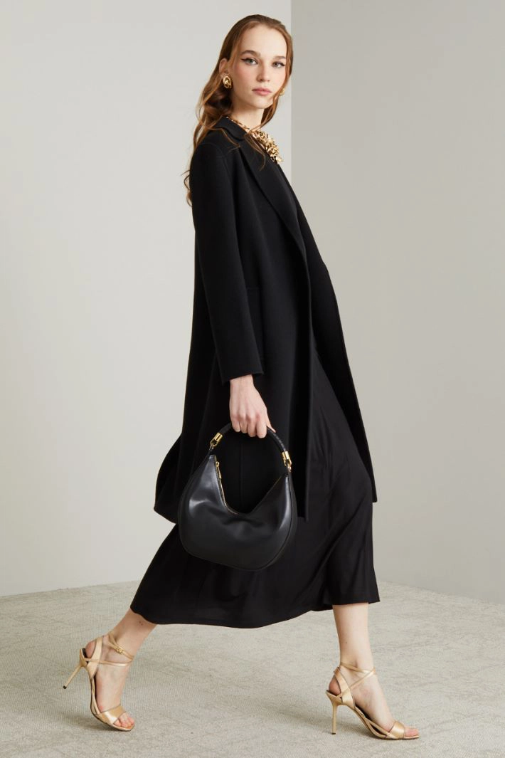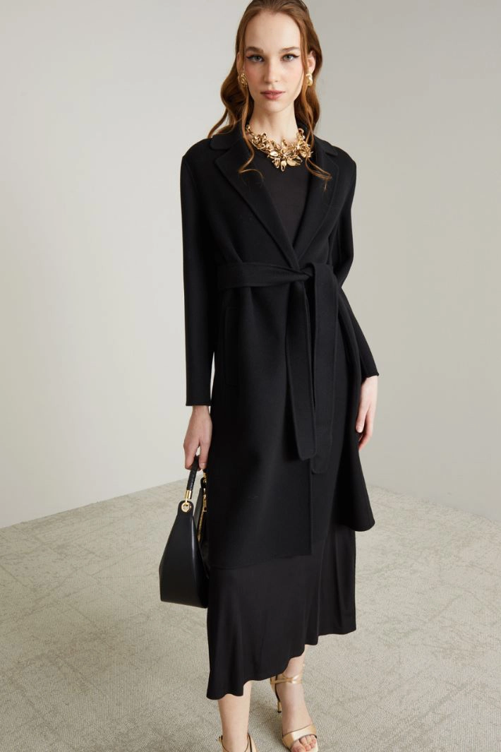 Long straight-fit dressing wrap coat in double pure wool cloth, with lapel collar, long sleeves, side welt pockets and central slit on the back. Fastening with a matching belt. Unlined.