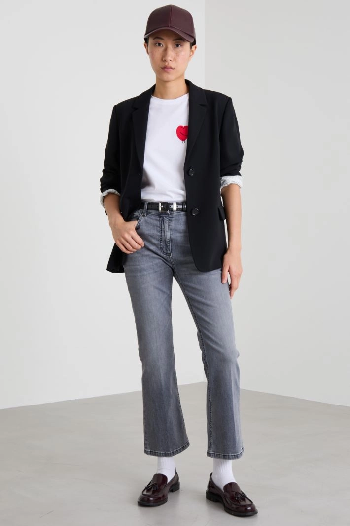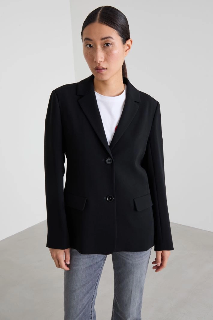 Straight-fit cady blazer with lapel collar, long sleeves with buttons, flap pockets and central vent on the back. Button fastening. Lined.