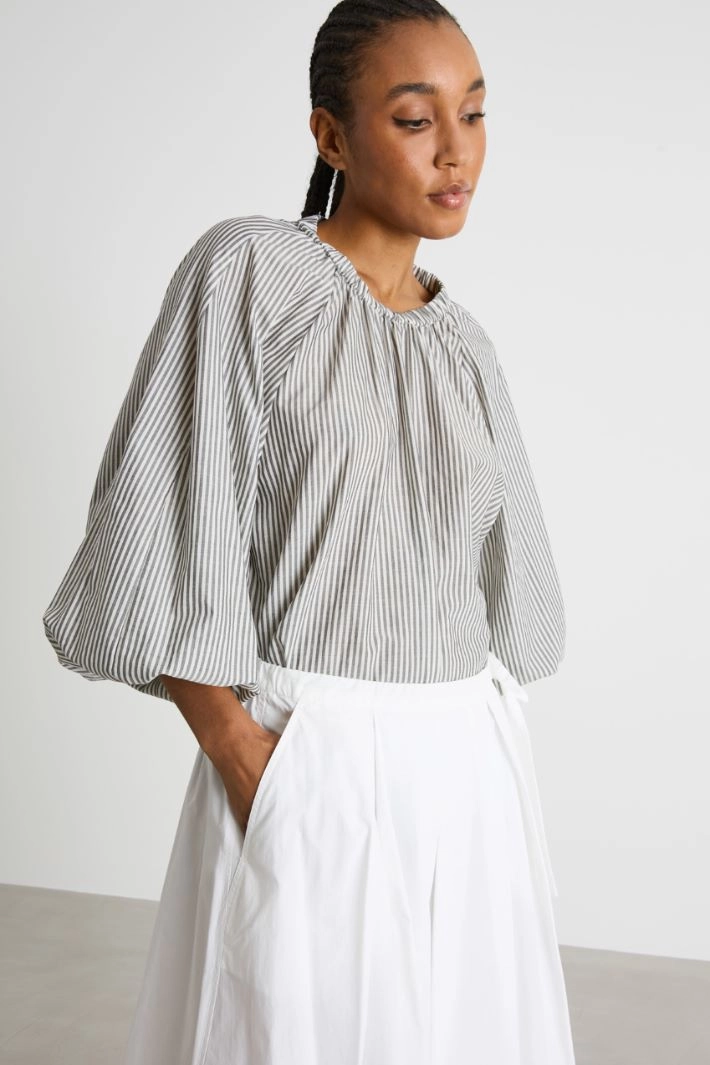 Crafted from lightweight printed pure cotton muslin, this A-line blouse features a shirred neckline on the front and back, long raglan balloon sleeves and elasticated cuffs.