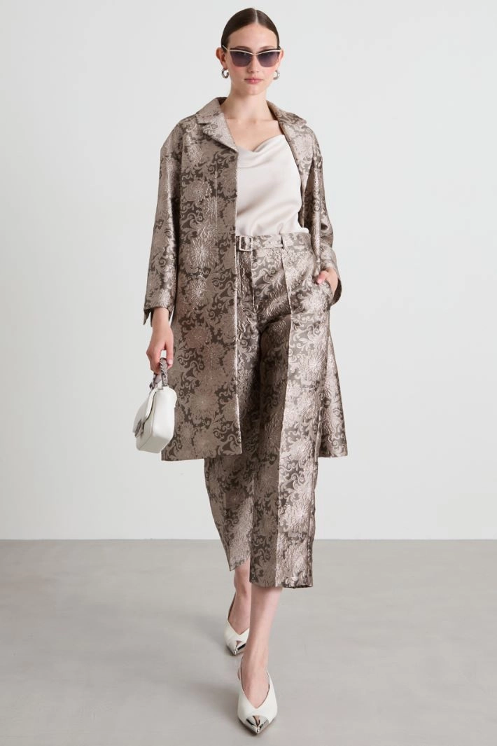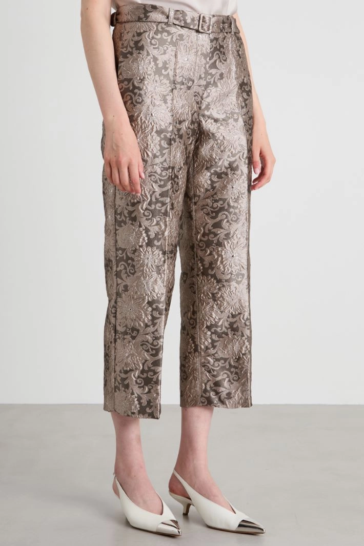 Straight-cut trousers in lamé brocade jacquard fabric, with belt loops, inset pockets, crease along the length and a matching belt. Hidden fastening with zip, button and hook.