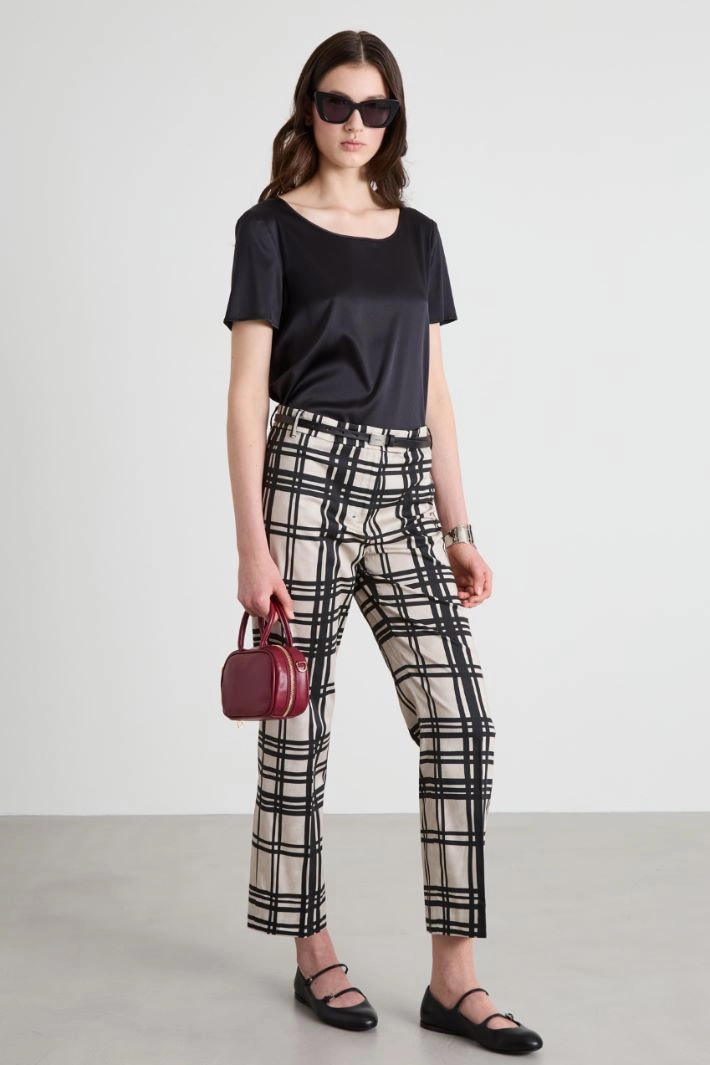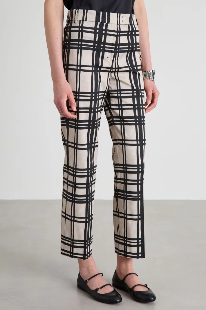 Straight-fit trousers in stretch cotton jersey, with a lengthwise crease, belt loops, and hidden fastening with zip, button and hooks.