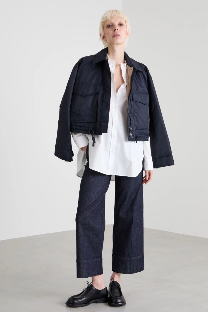 Machine wash cold delicate cycle; do not bleach; do not tumble dry; line drying in the shade; cool iron; professionally dry clean perchloroethylene - mild process.; wash the garment while it is fastened.; take care when wearing light-coloured clothes or accessories because, with the heat of the body, the indigo fabric , may fade and stain. be careful while sitting on light coloured surfaces, especially if wet. wash garments separately and always turned inside out. hang the garment turned inside out by avoiding to expose it to direct sunlight. avoid removing isolated stains.