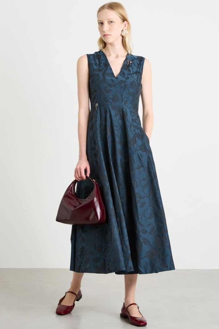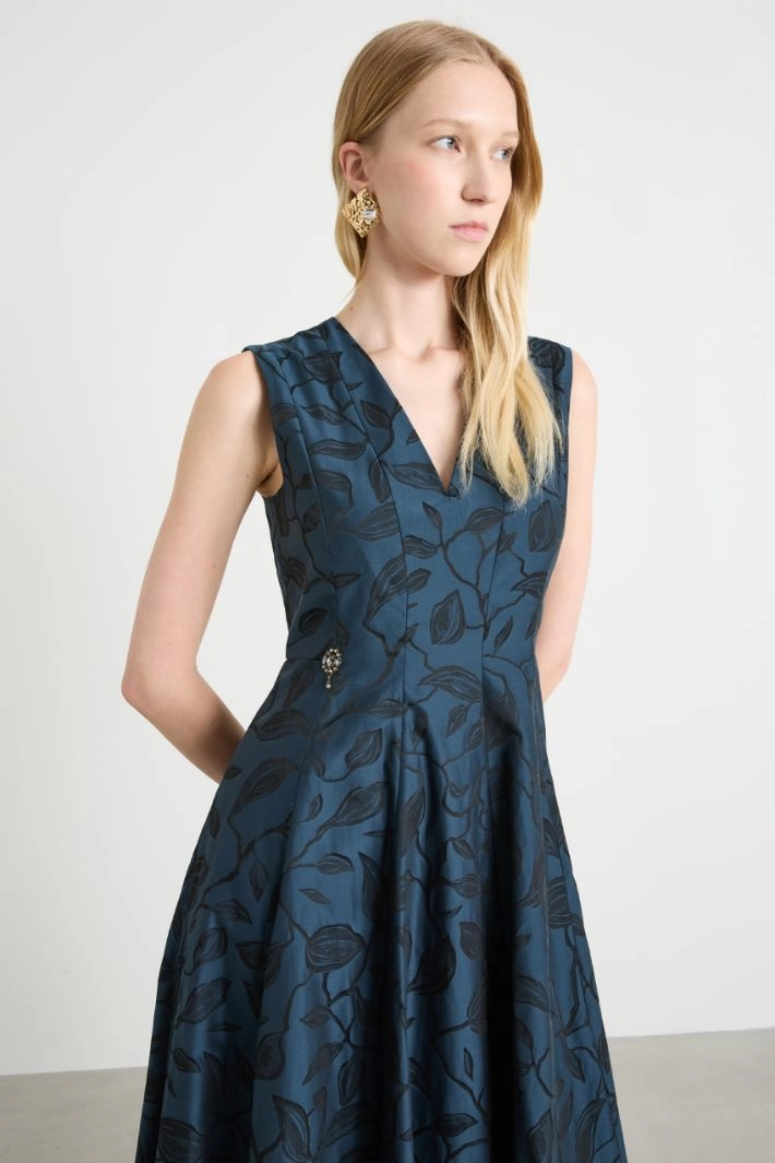 Flared dress in cotton blend jacquard canvas, with V-neck, inset pockets, tie straps on the back and removable embroidery motif. Invisible zip fastening on the back.
