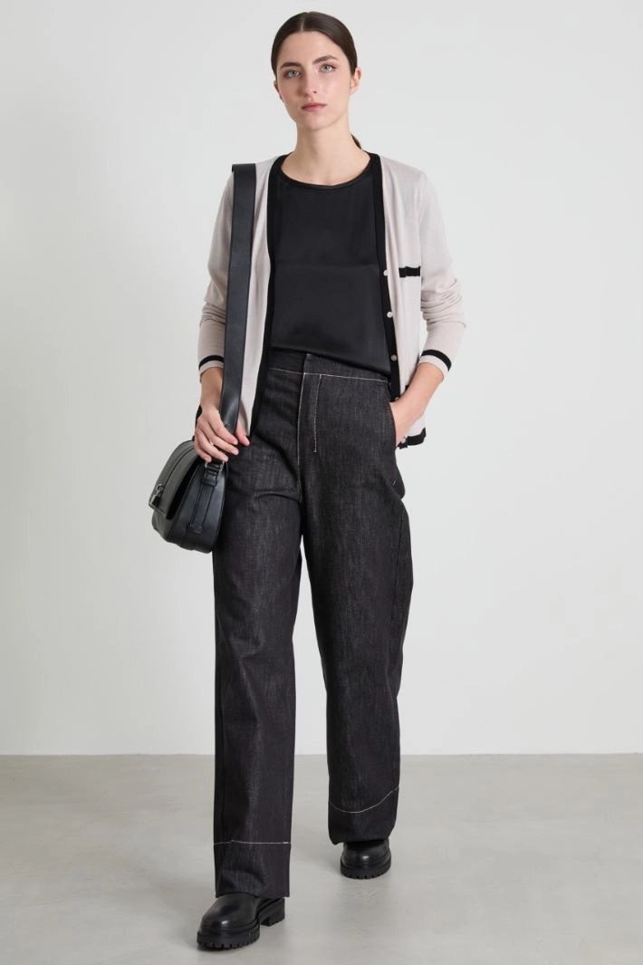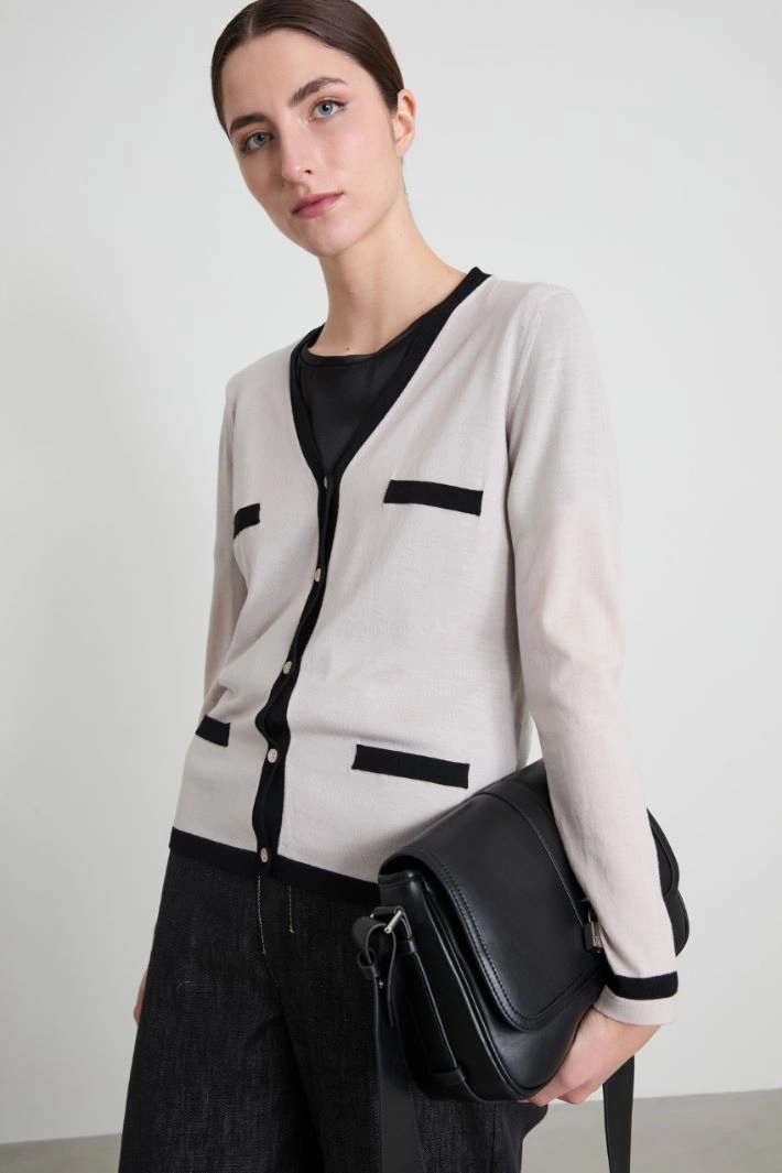 Regular-fit cardigan in pure wool yarn, with a V-neck, long sleeves, fake pockets on the front and contrasting trimmed edges. Fastening with visible buttons.