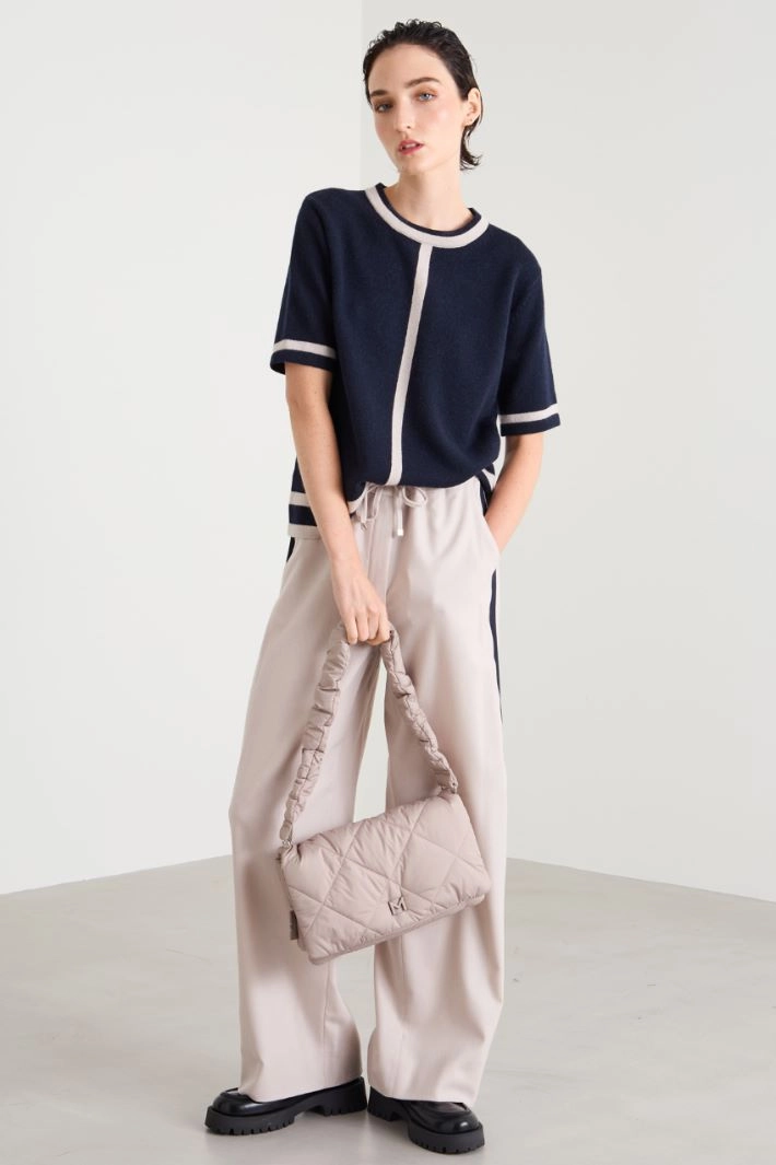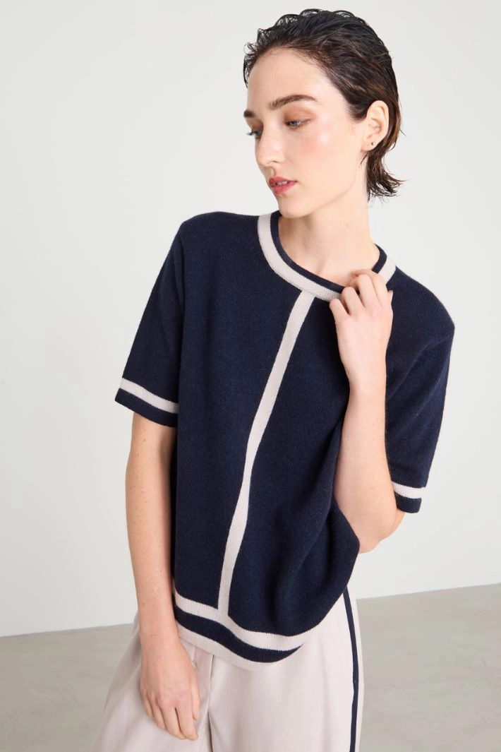 Straight-cut sweater in wool and cashmere yarn, with inlay, round neckline and short sleeves.