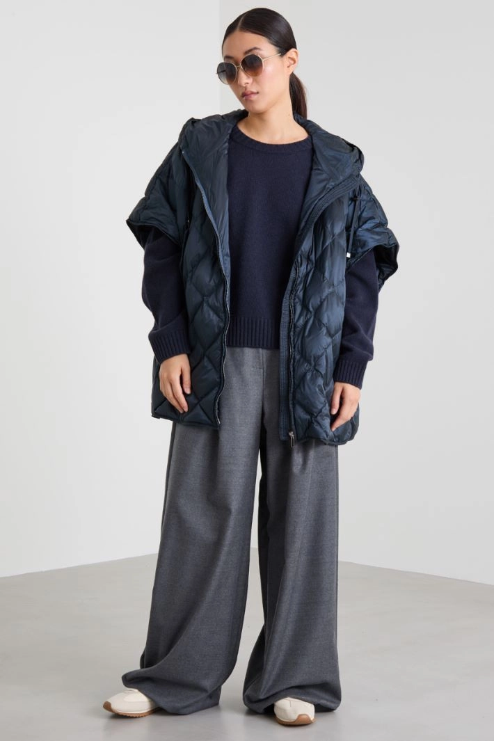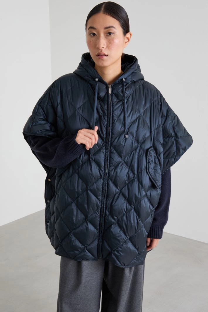 Straight fit padded cape in shiny water-repellent technical satin, with quilted motif, hood with drawstring, short kimono sleeves and side welt pockets with flap. Model that opens on the sides with press studs and asymmetrical hem longer on the back. Zip fastening.